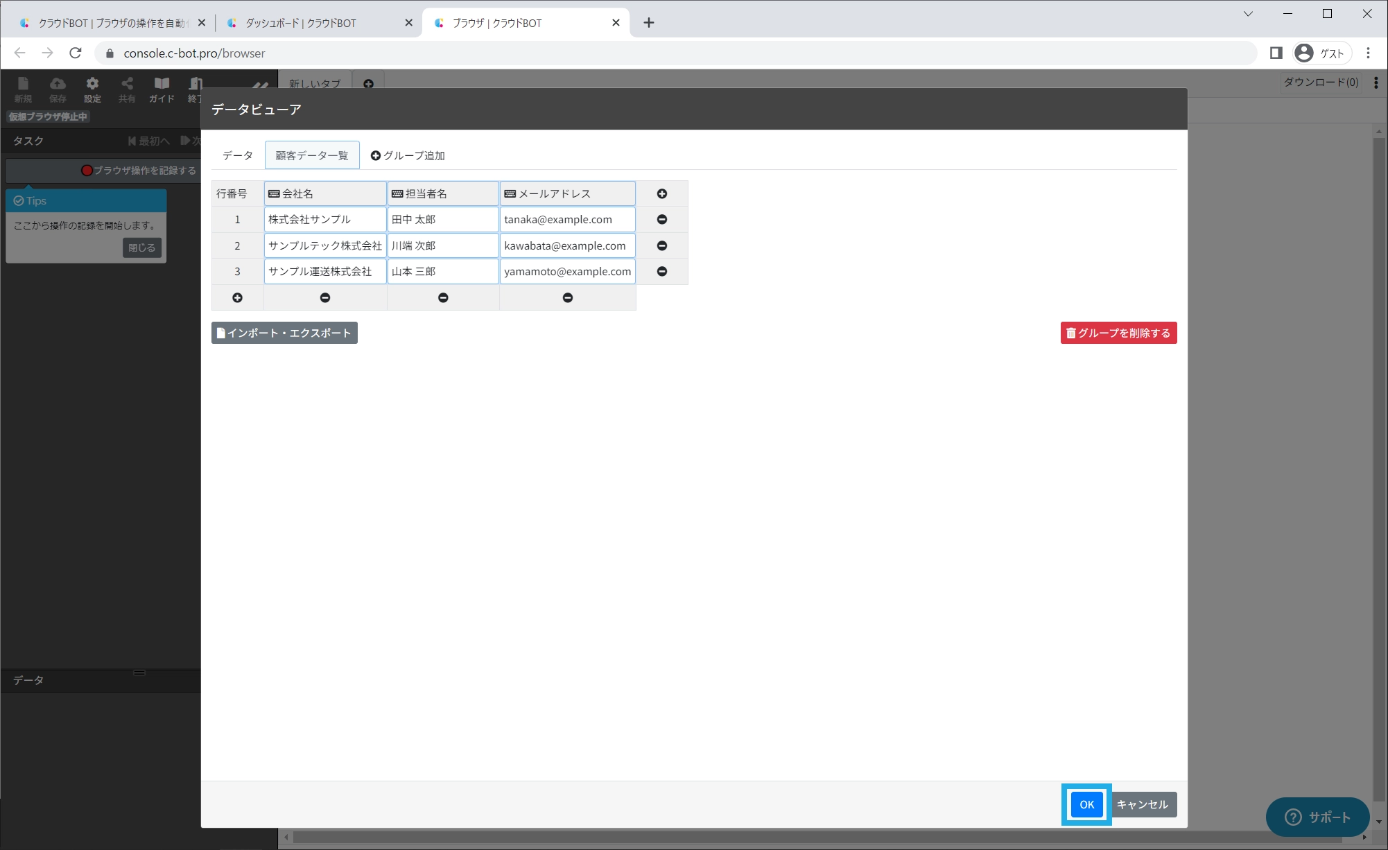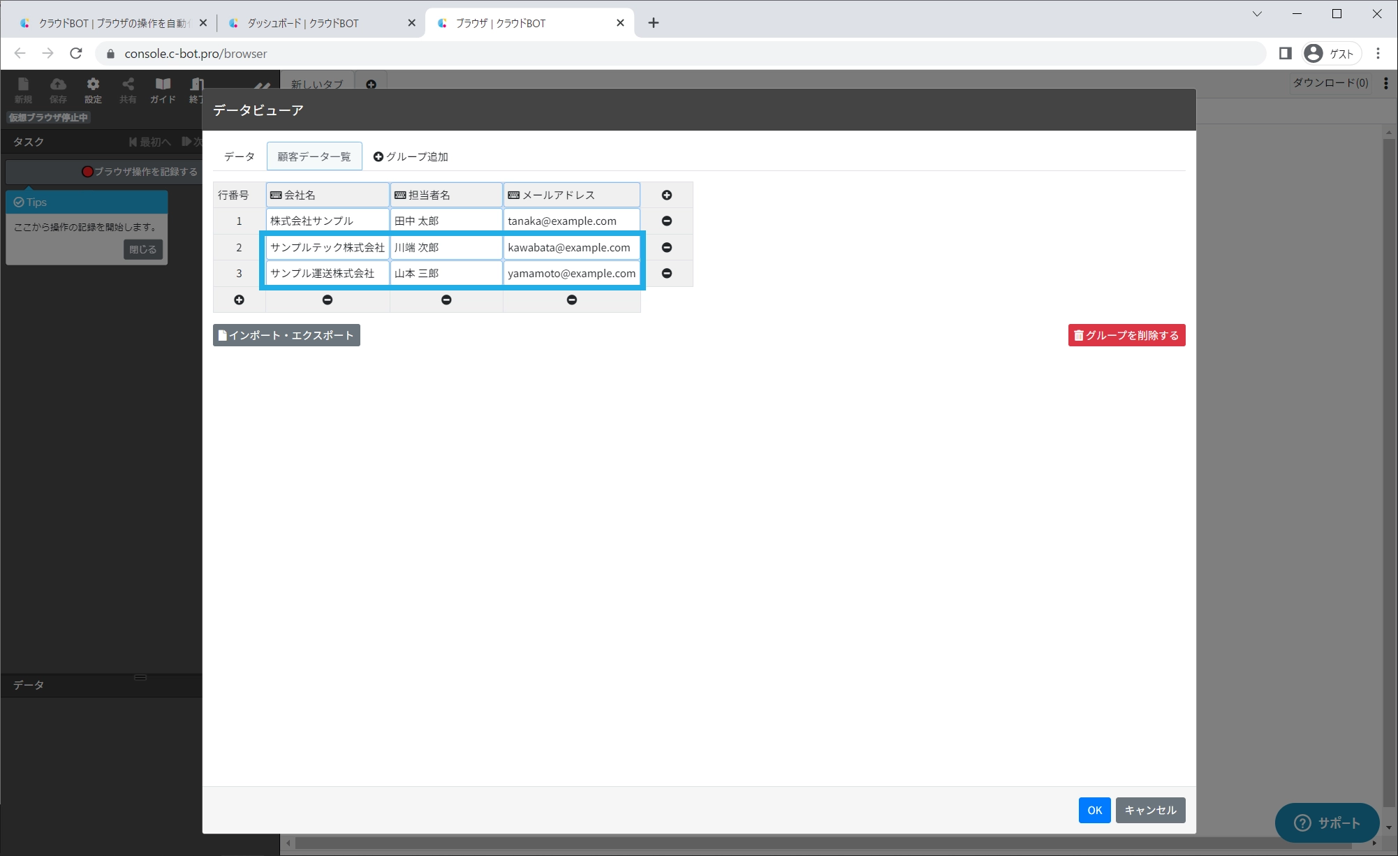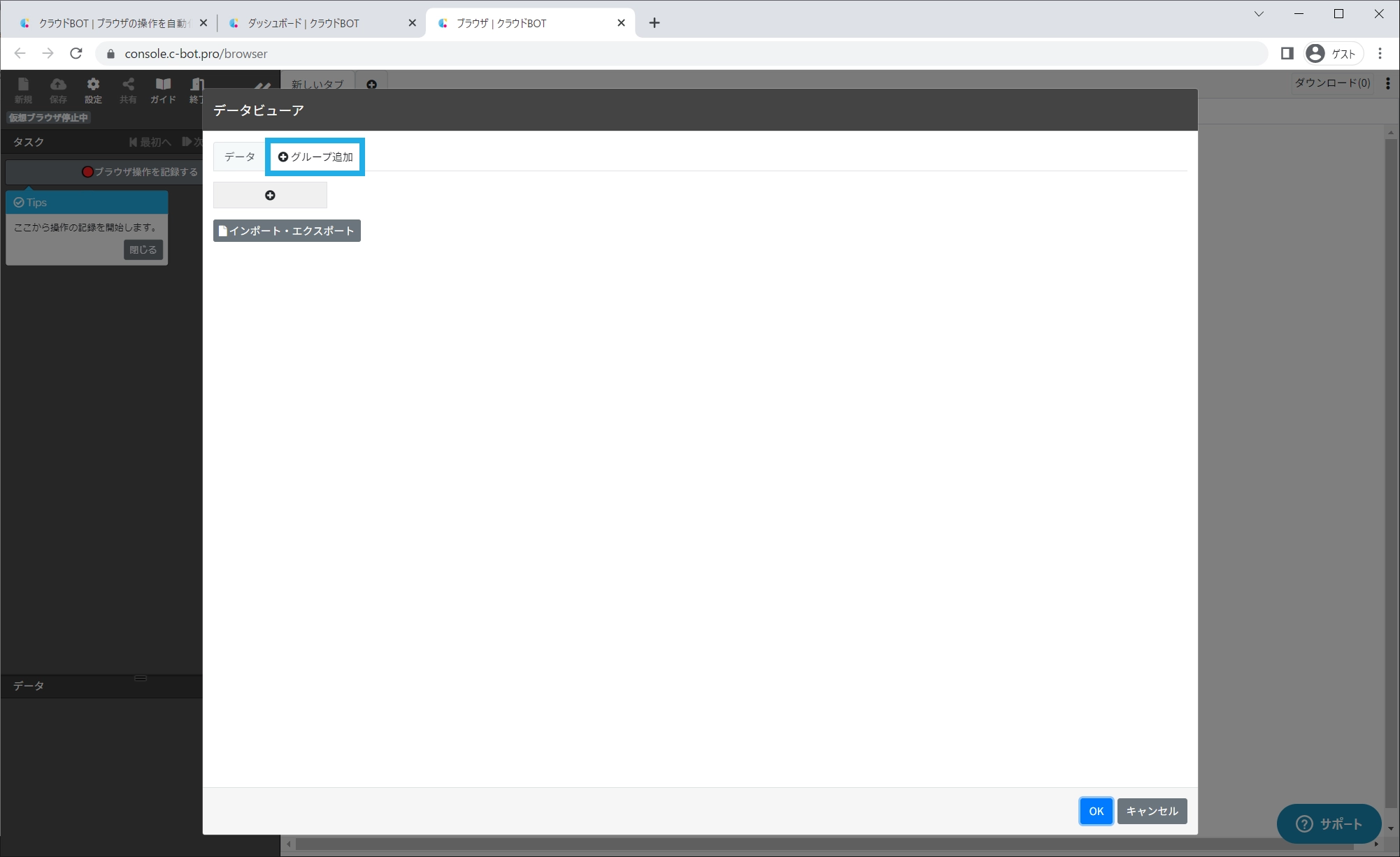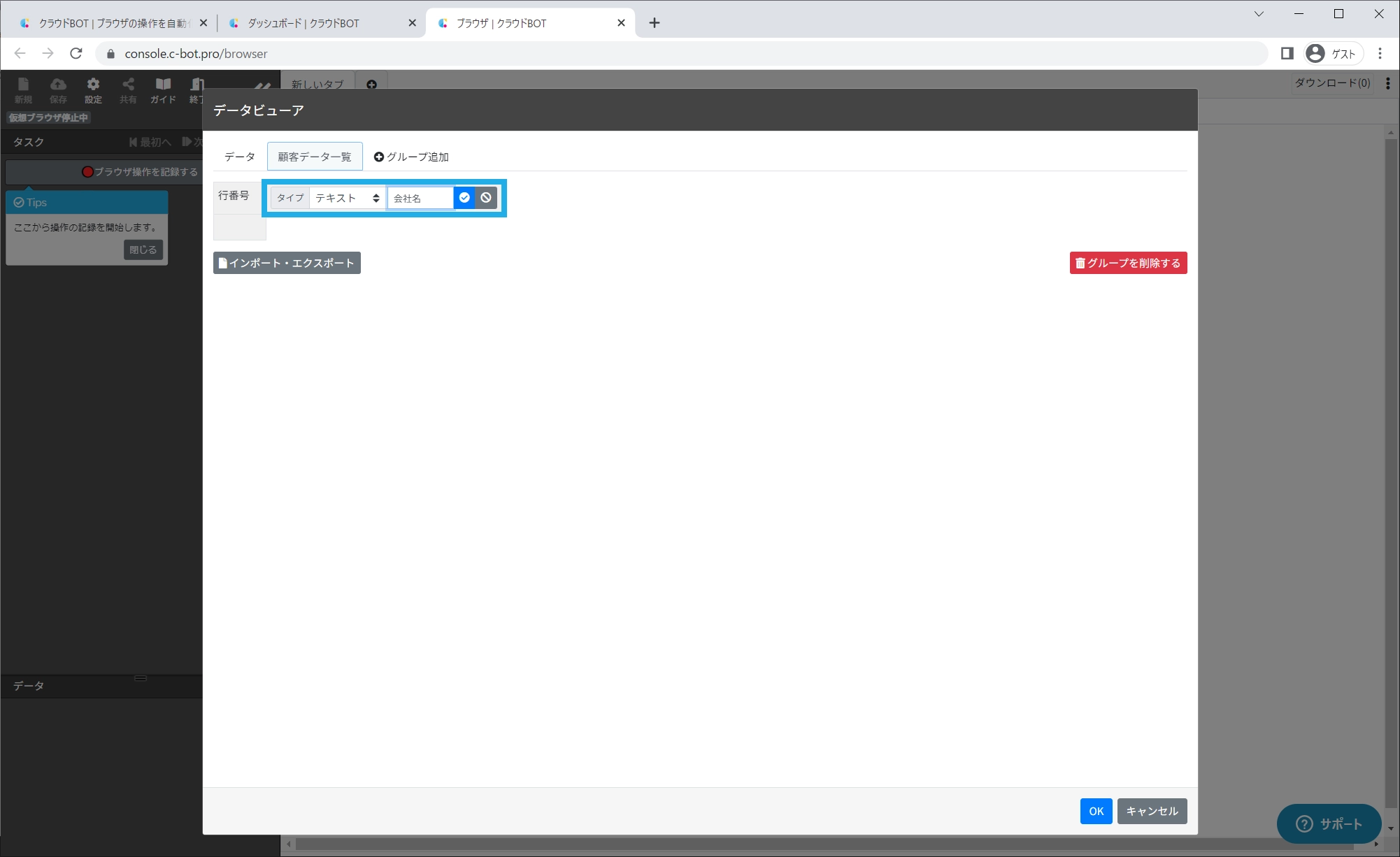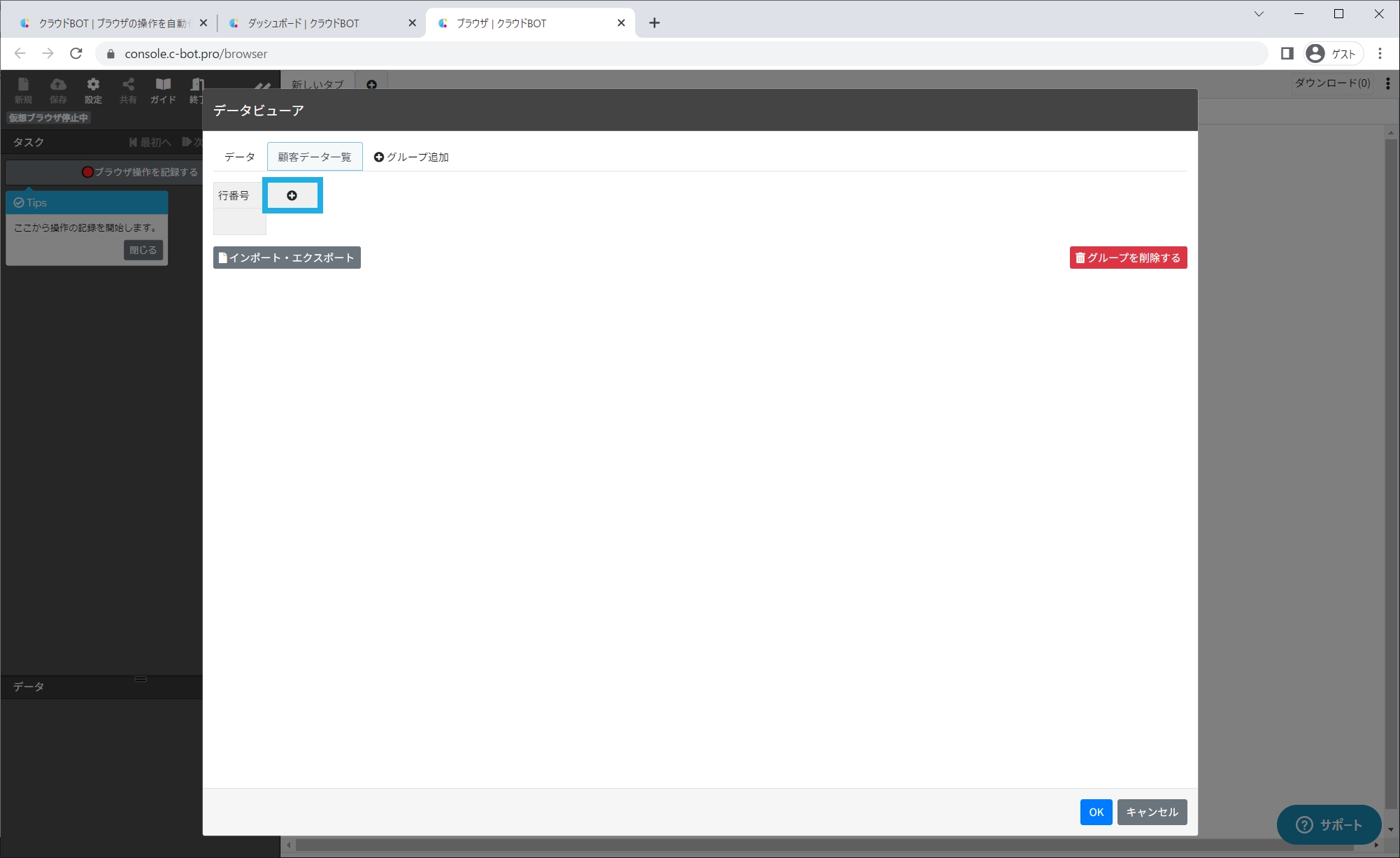 クラウドBOTではグループデータを使用し、一覧データの操作や繰り返し(ループ)処理を行います。