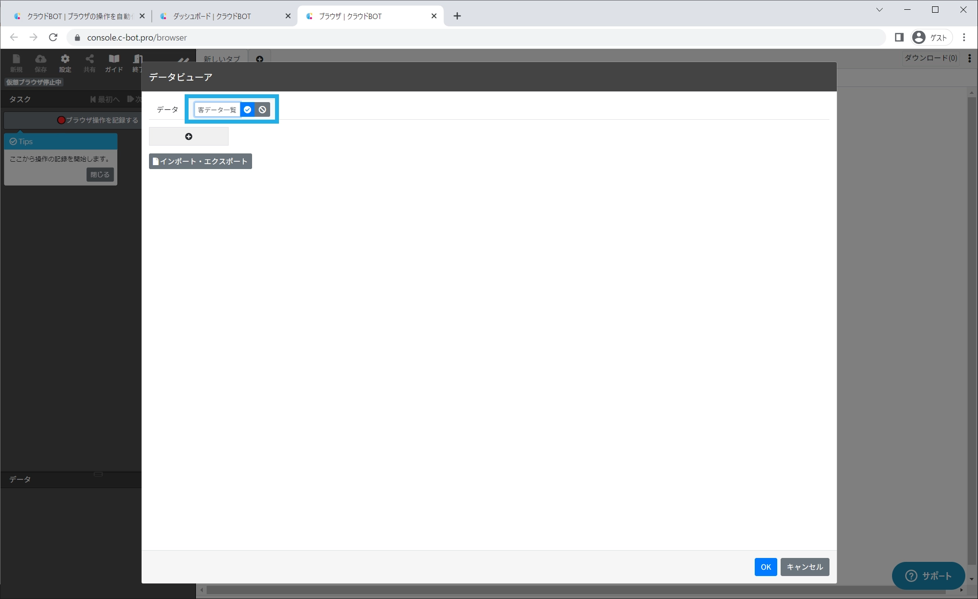 ※クラウドBOTの基本的な操作につきましては、『基本編 - 1-1. Webページからデータを取得する (基本操作の解説を含む)』をご参照下さい。