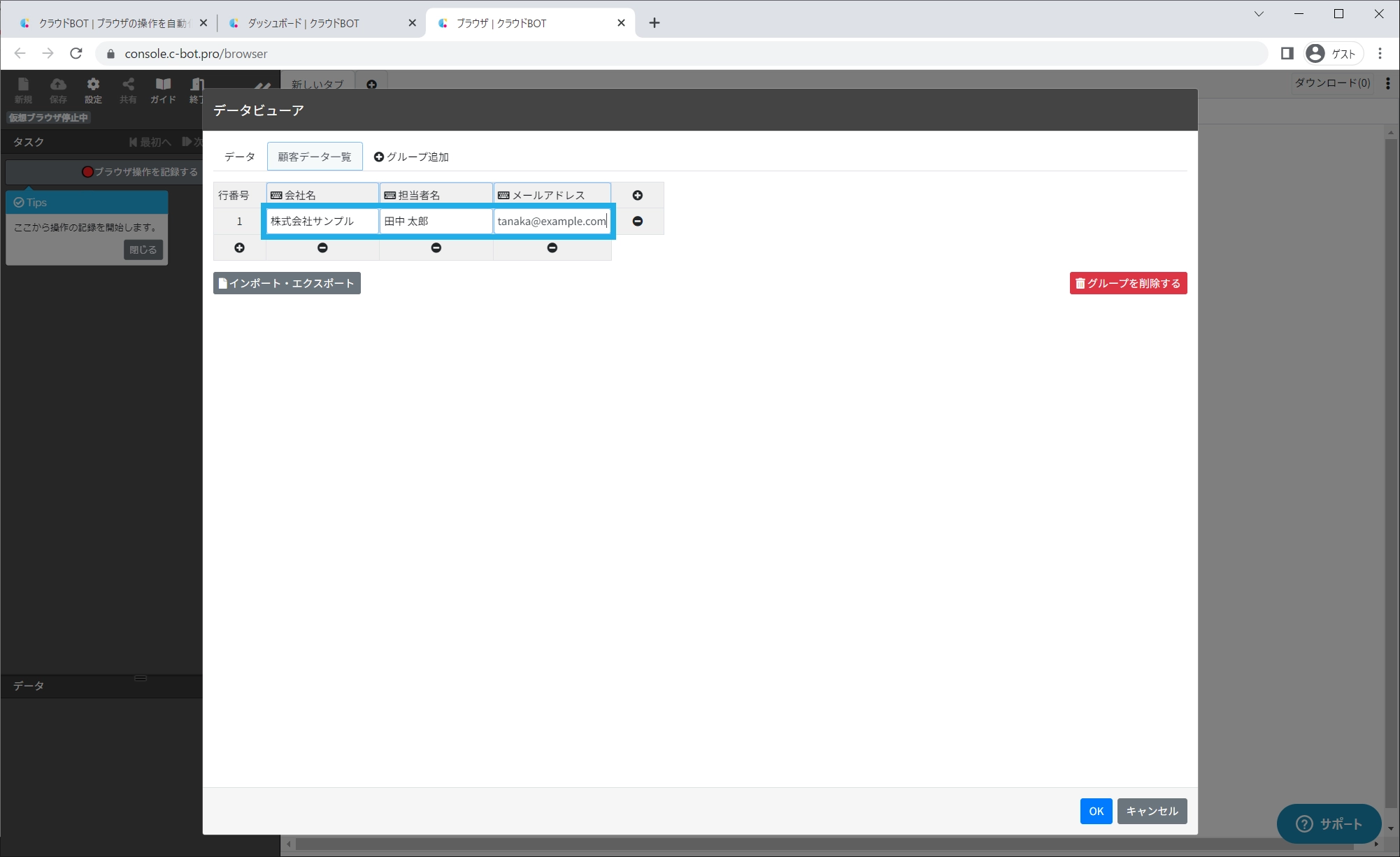 データを入力する欄が表示されますので、会社名の列に株式会社サンプル、担当者名の列に田中 太郎、メールアドレスの列にtanaka@example.comを入力します。