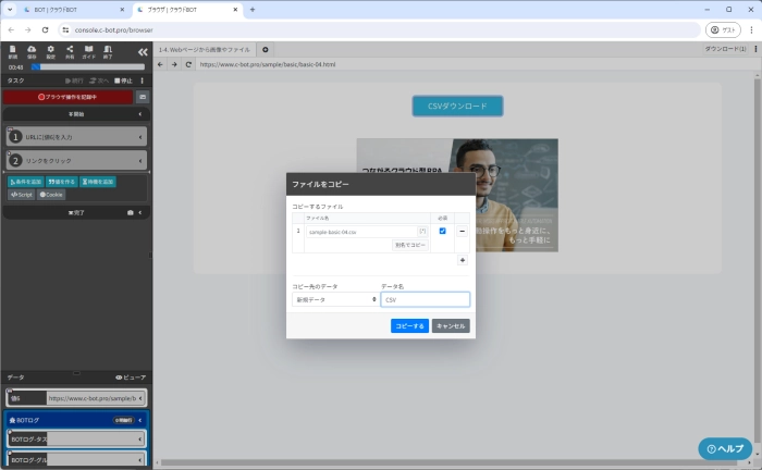仮想ブラウザにダウンロードされたファイルをBOTのデータとしてコピーする操作を記録します。