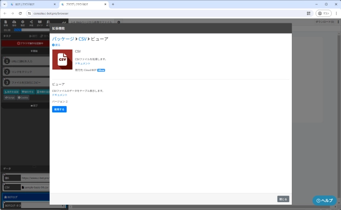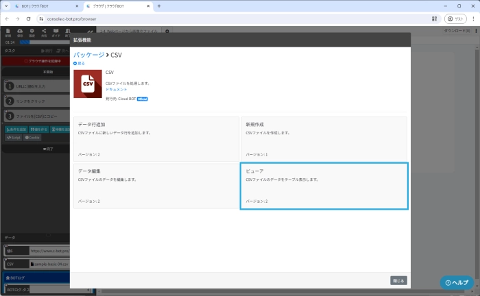 仮想ブラウザ上に拡張機能「CSV / ビューア」のアプリが表示されます。