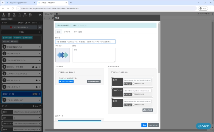 “BOT名”を4-1. 拡張機能「CSV/ビューア」を使用し、CSVをグループデータに変換するに変更し、BOTを保存します。