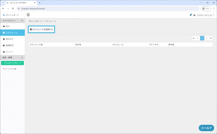 クラウドBOTの管理画面のメニューより、「スケジュール」をクリックします。
