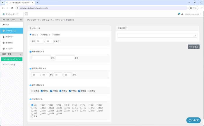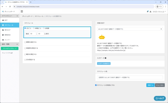 作成したBOTに対してスケジュールを登録する事により、決まったタイミングで自動実行する事ができます。