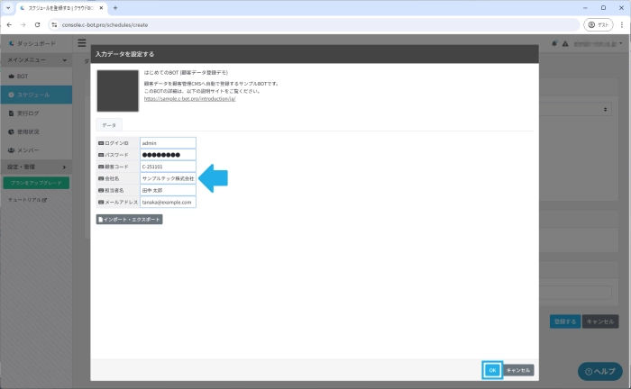 “対象のBOT”から、「はじめてのBOT(顧客データ登録デモ)」を選択します。