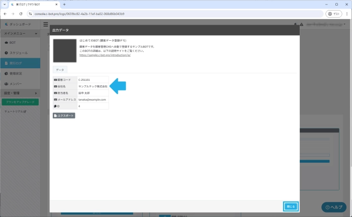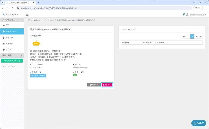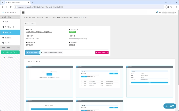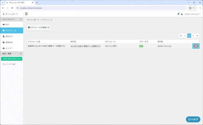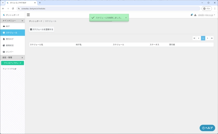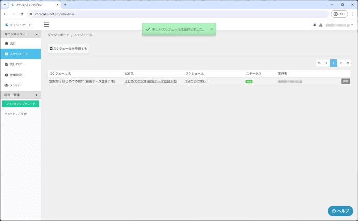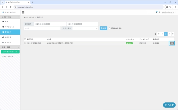 スケジュールを保存してから5分経過後、クラウドBOTの管理画面のメニューより、「実行ログ」をクリックします。